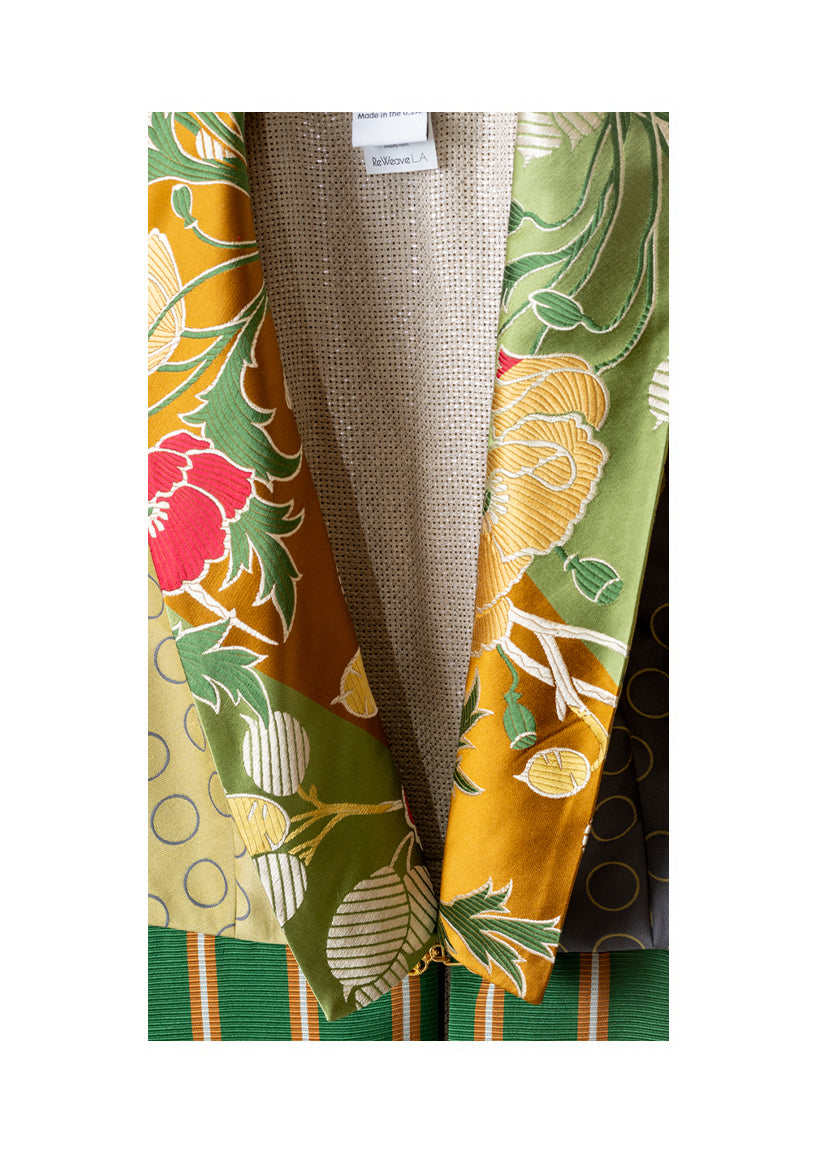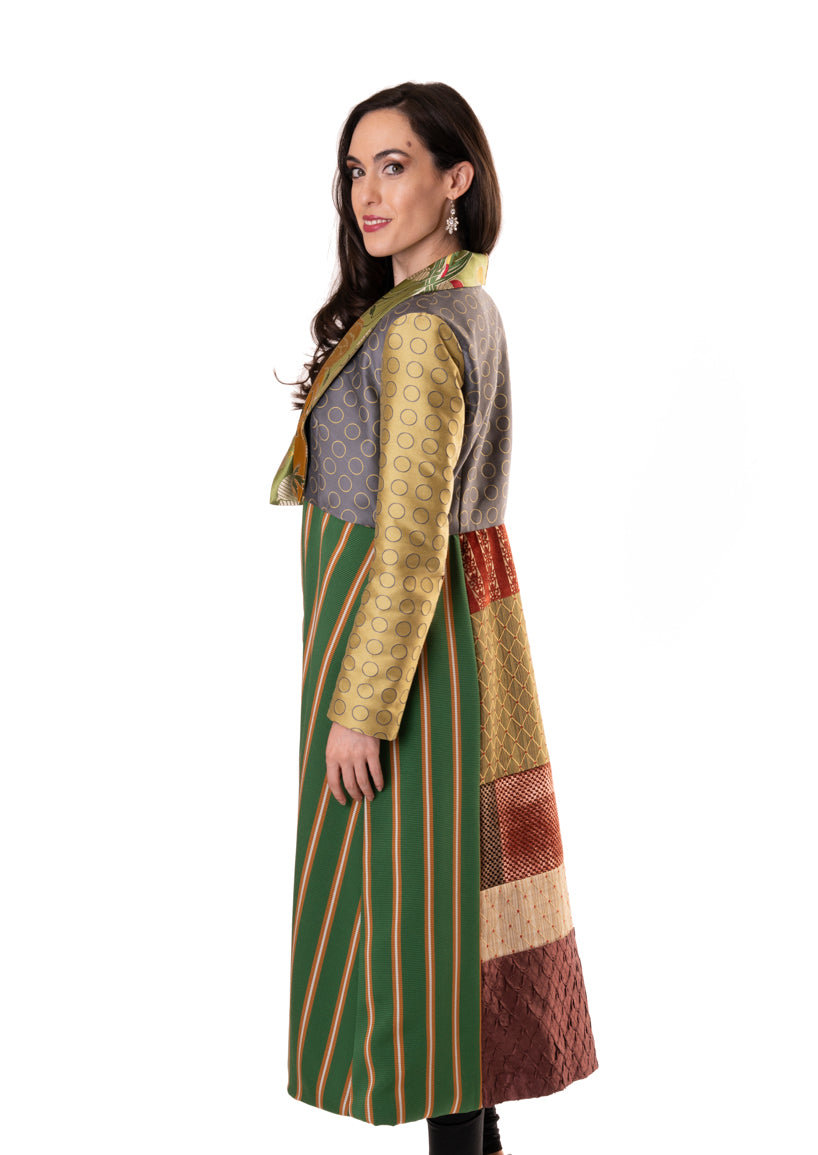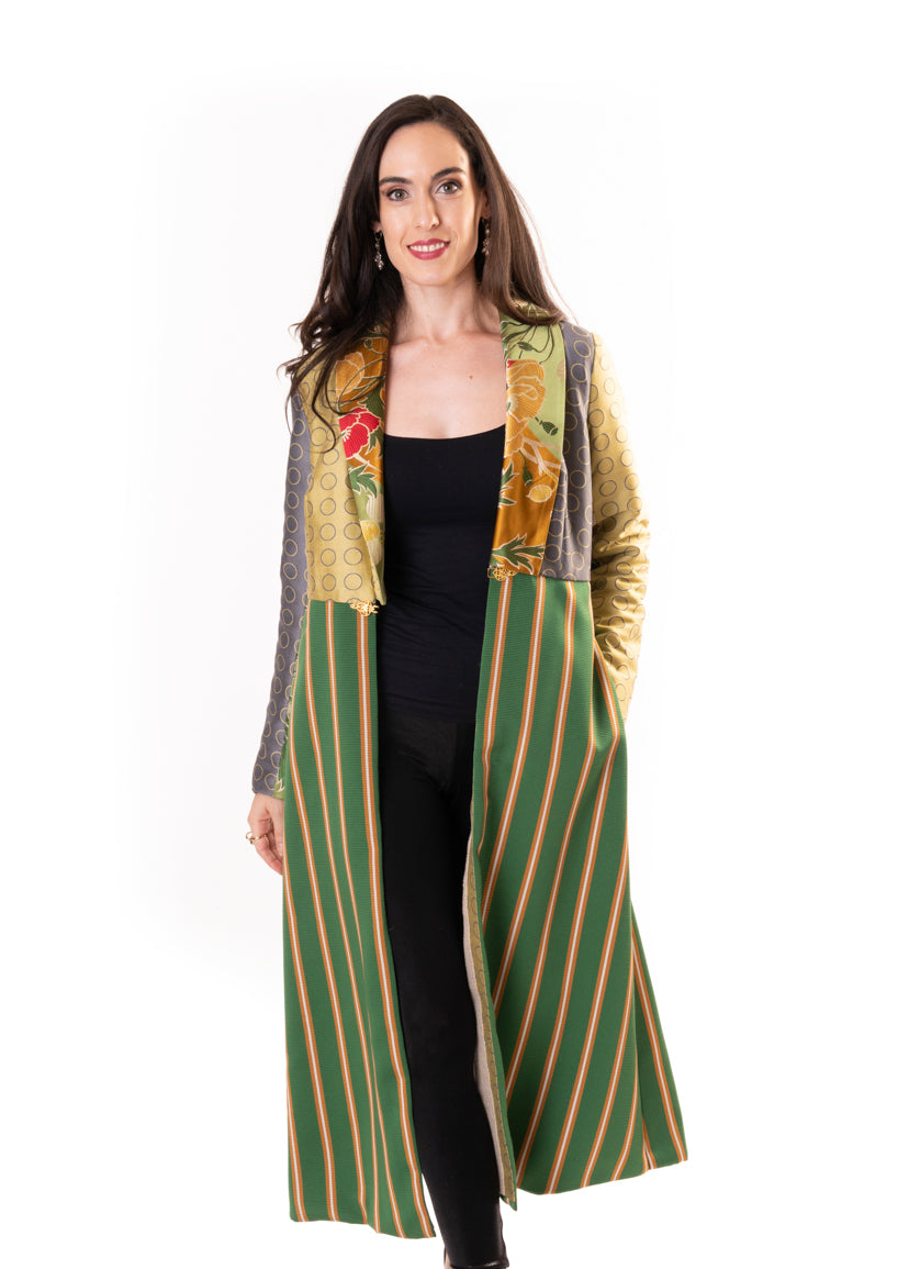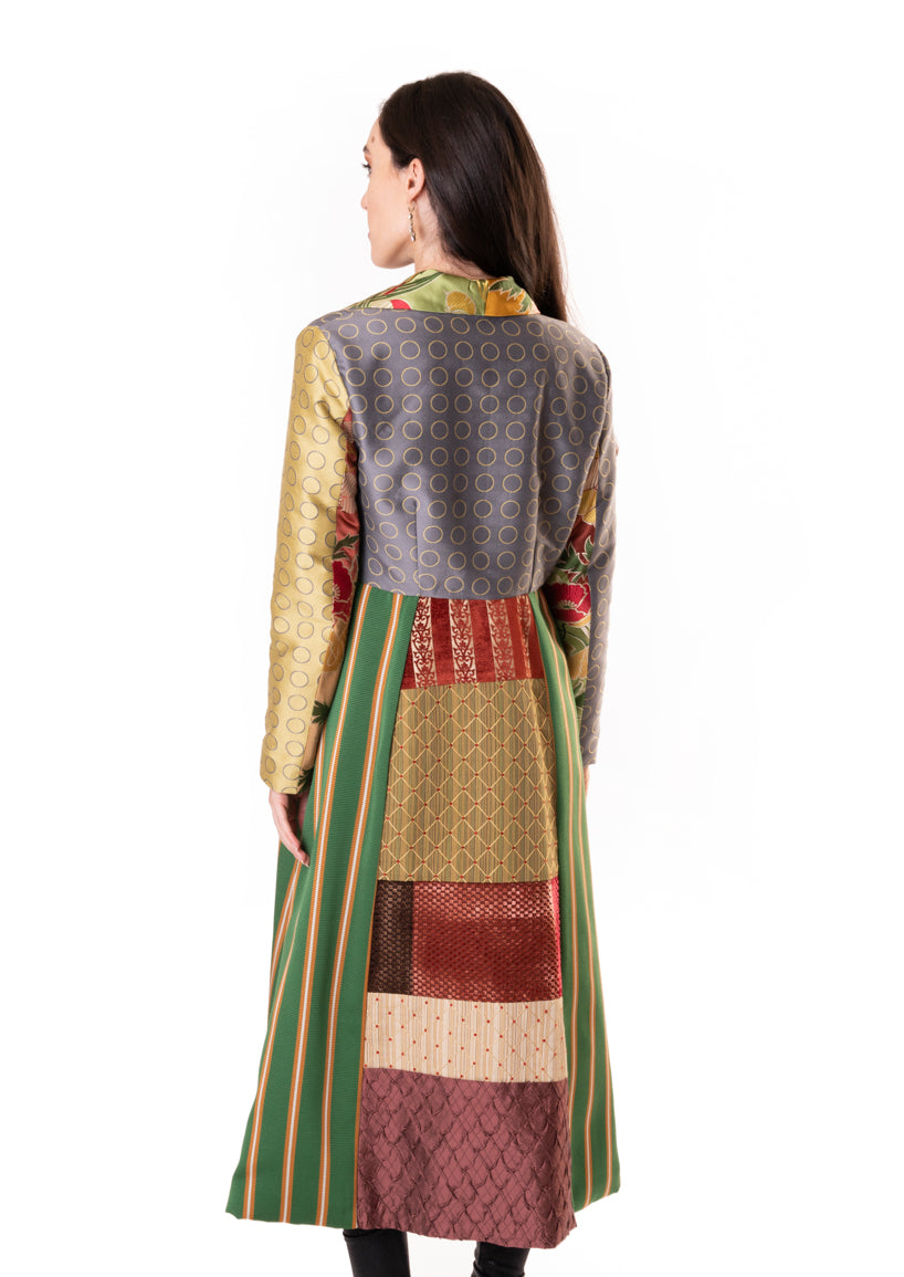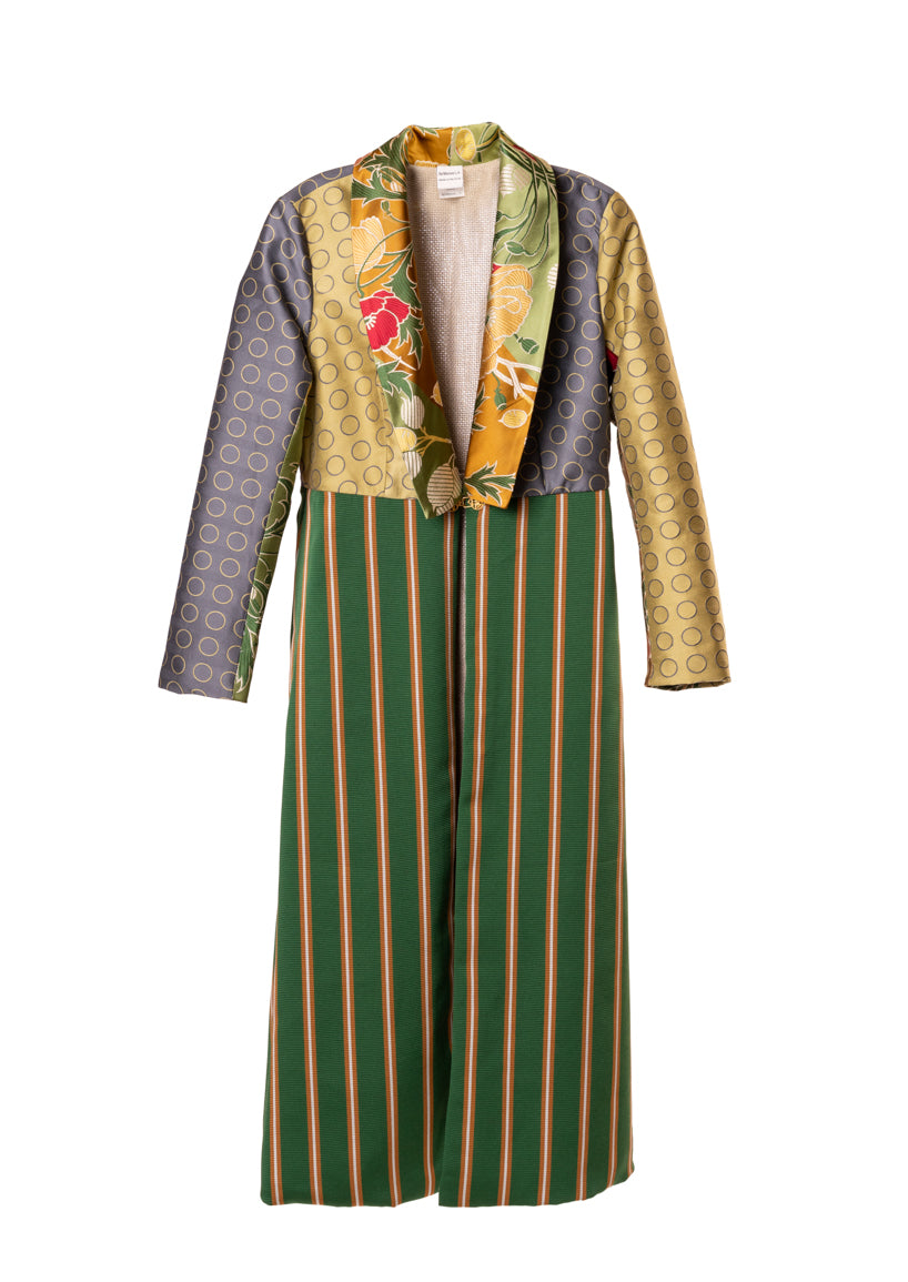 You will be a standout in this stylish coat with a distinctive collar in a floral print and the emerald and gold striped skirt. The varied fabrics on the back complement the colors on the collar. Pockets on each side.